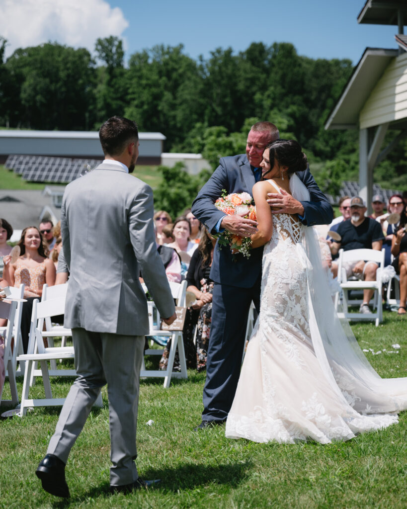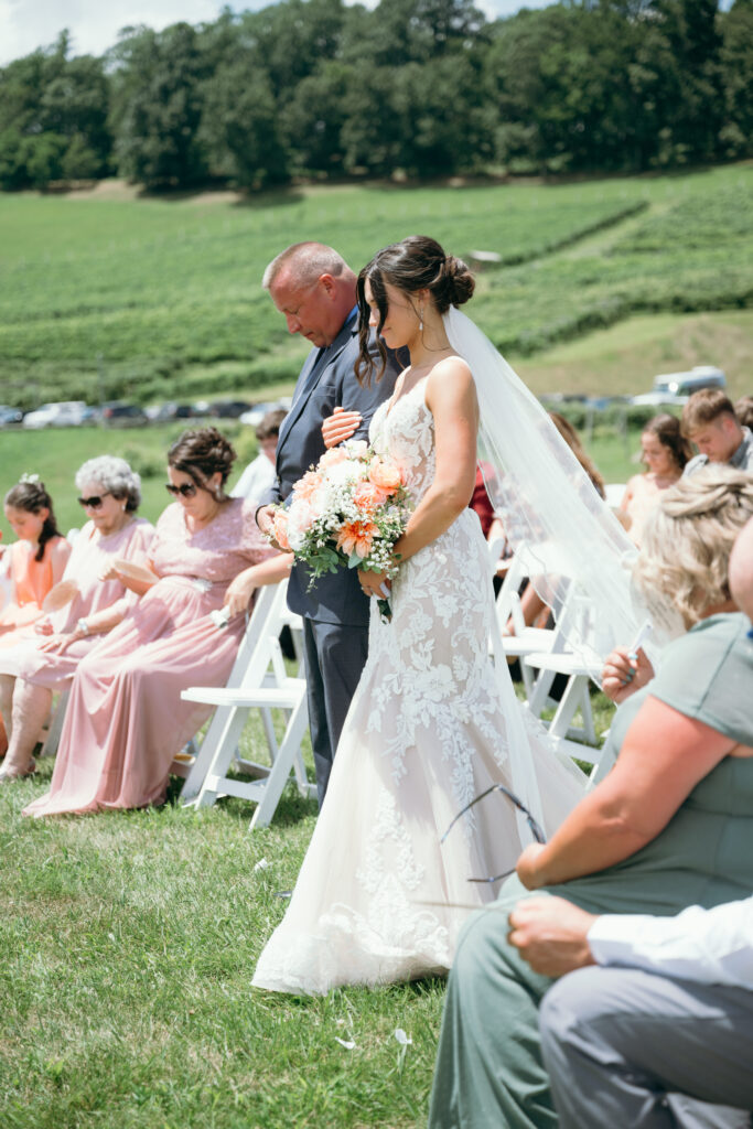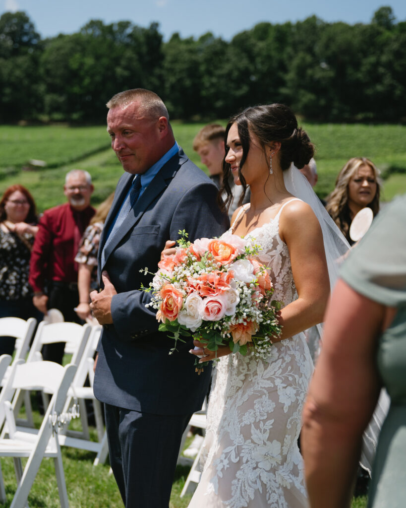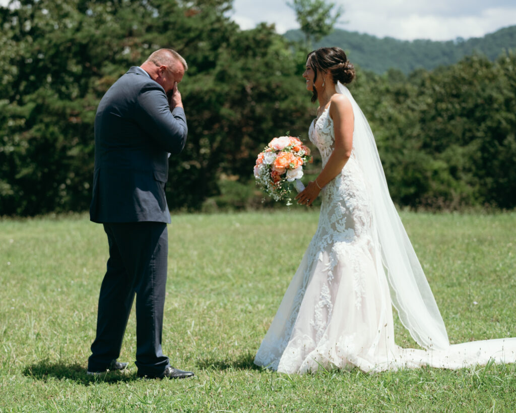 One of the most emotional moments of the day happened before the ceremony. Breanne shared a private first look with her dad at the top of the mountain overlooking the vineyards. As she walked toward him with the rolling Virginia hills stretching endlessly behind her, the moment was filled with overwhelming emotion. The views were breathtaking, but nothing compared to the love and pride shared between father and daughter.